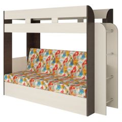 Верхняя кровать "Соня-1" имеет спальное место размером 80*190 см, комплектуется шкафом для одежды и других вещей в торцевой части, полками для учебных пособий или игрушек под спальным местом и устойчивой лестницей с металлическими ступенями.