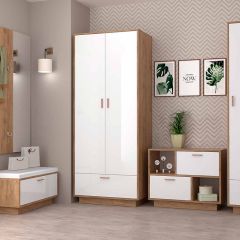 В комплект входит: кровать, внизу которой расположены вместительный угловой шкаф (полки и штанга), стеллаж для книг и компьютерный стол с дополнительным столиком.